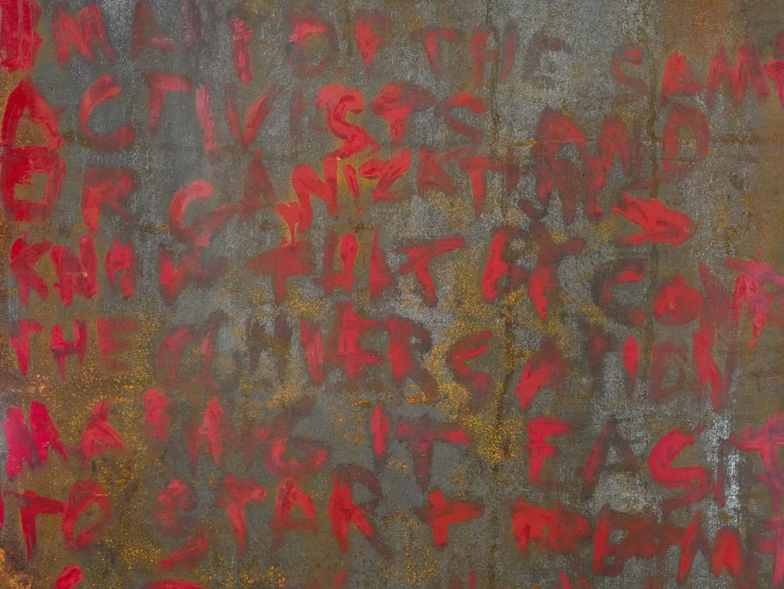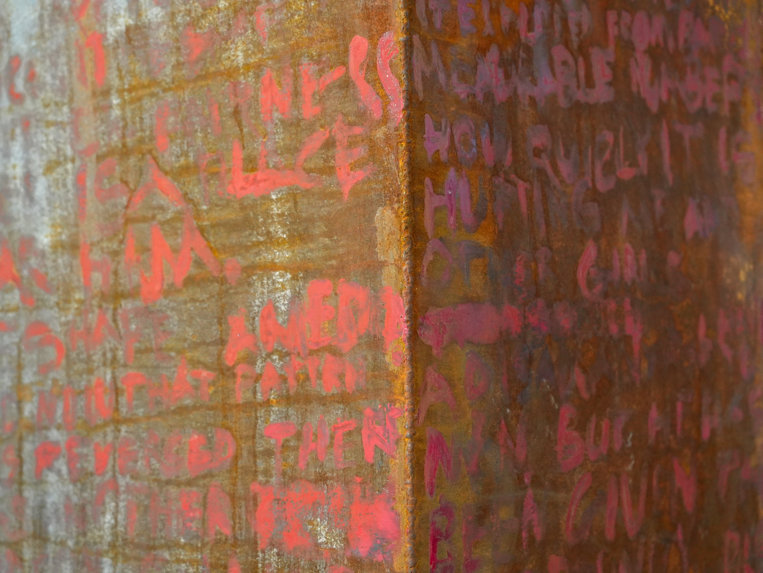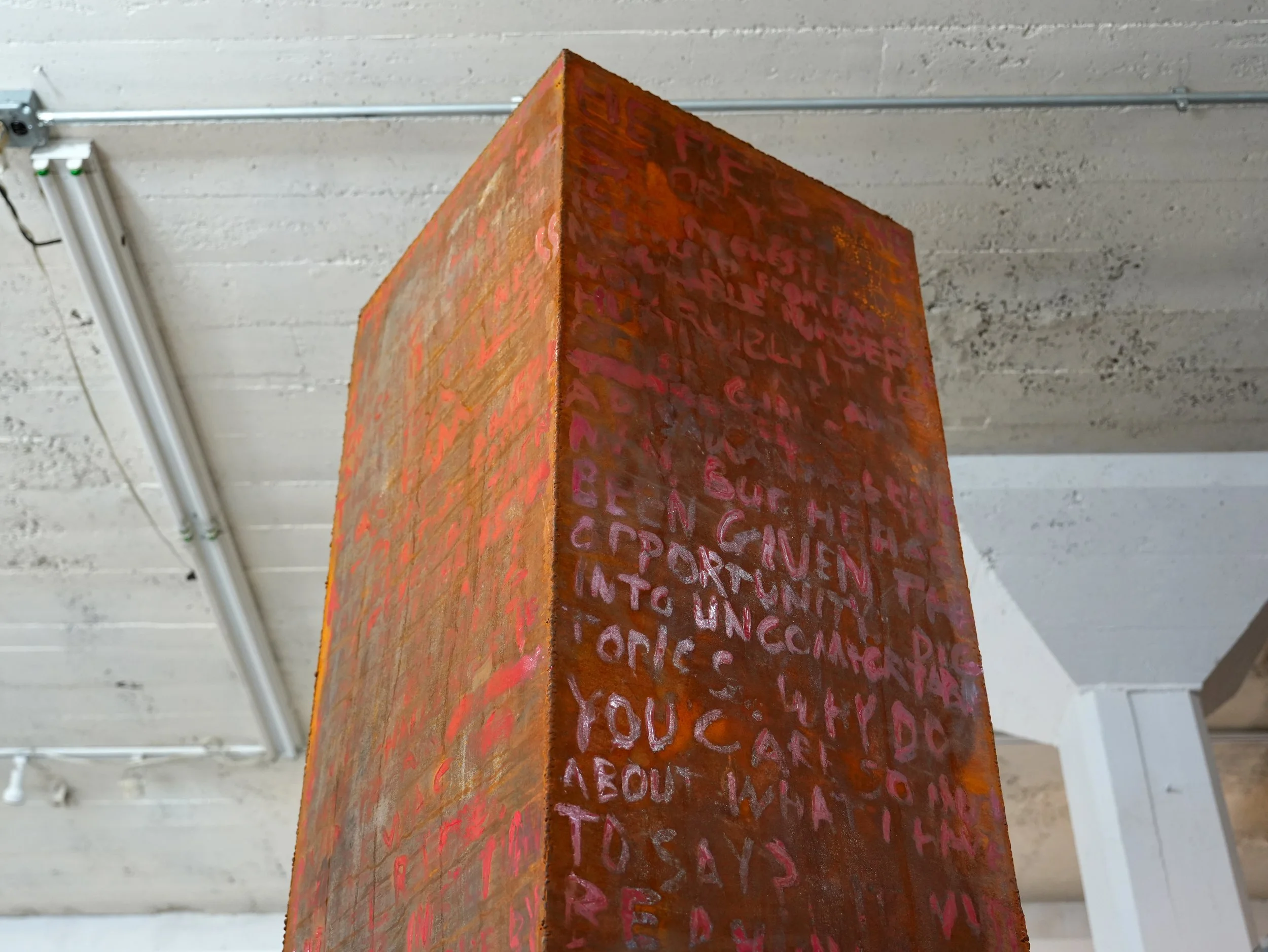 The text painted on this sculpture is cobbled together from the transcripts of the most 4 viewed videos on YouTube that come from searching the words “transgender woman” as of September 2025.