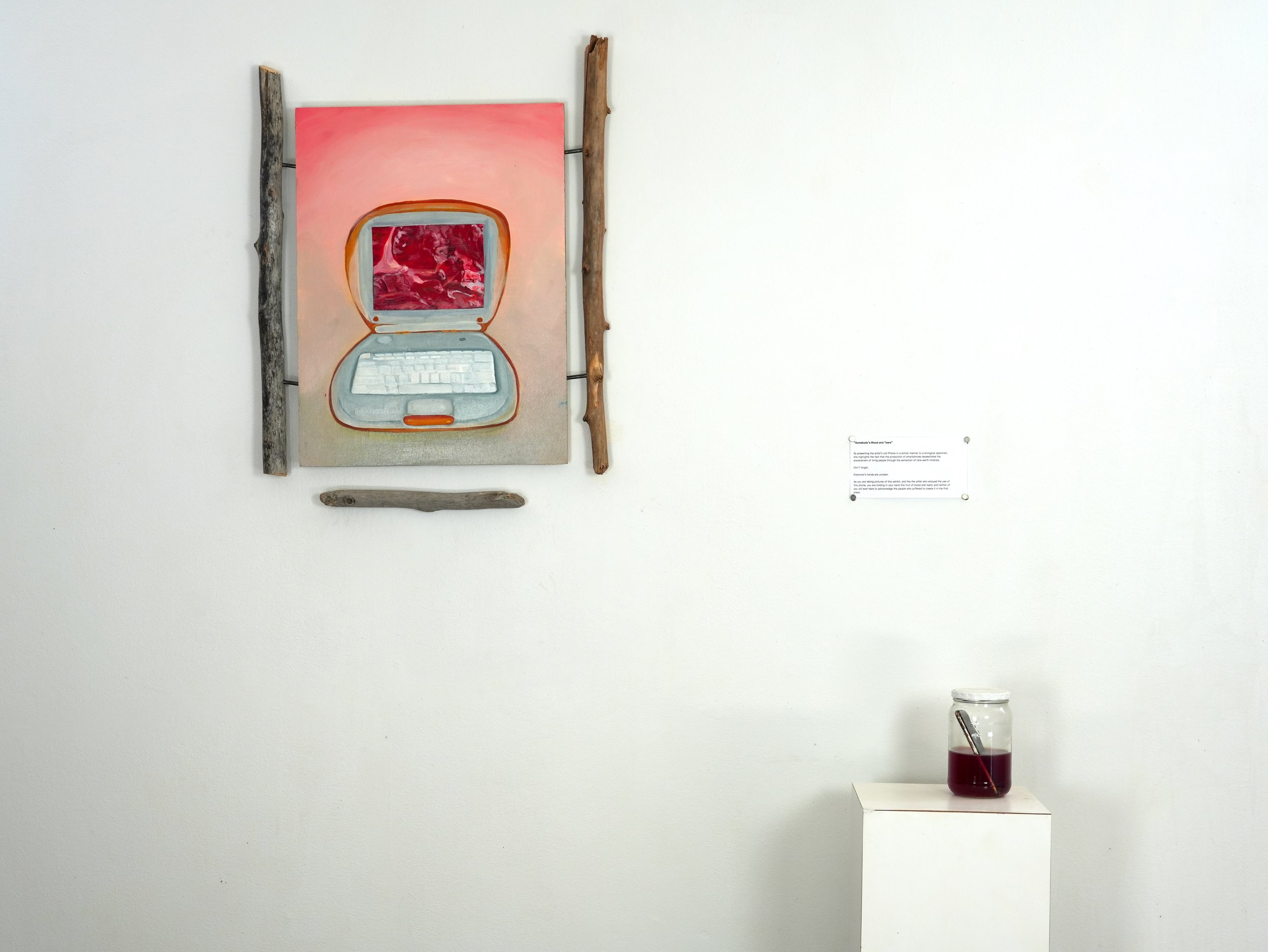 By presenting my old iPhone in a similar manner to a zoological specimen, I propose the idea that smartphones, as they are typically used, become something more akin to a body part, rather than a mere tool. Through the use of blood, I highlight the fact that the production of smartphones necessitates enslavement through the extraction of rare-earth minerals, and manufacturing. While you read this statement, you are holding in your hand this fruit of blood and tears; you will never have to acknowledge the people who suffered to create it in the first place.