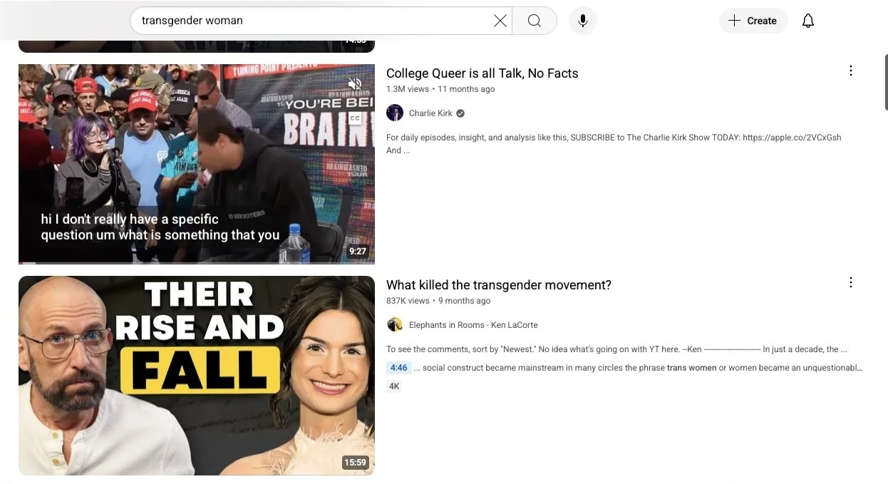 Search criteria and results for the “transgender woman” search:
